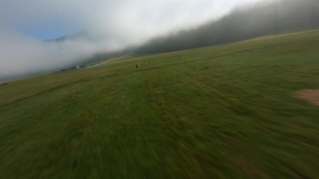 Aerial rotation panoramic view couple running on green grass mist field hugging with love best feeling outdoor. FPV sports drone shot enamored man and woman dancing embracing at foggy meadow landscape
