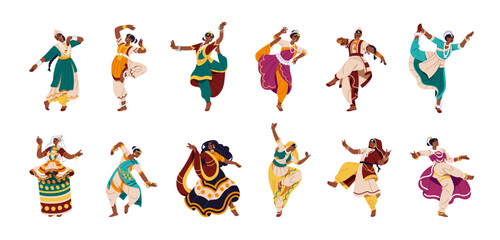 Indian dancers perform set. Women in sari show different traditional dances of India: bharatanatyam, odissi. People in national clothes move. Flat isolated vector illustrations on white background