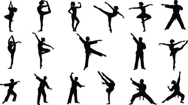 Silhouette of various yoga poses and dance moves, showcasing fitness, flexibility, and healthy lifestyle