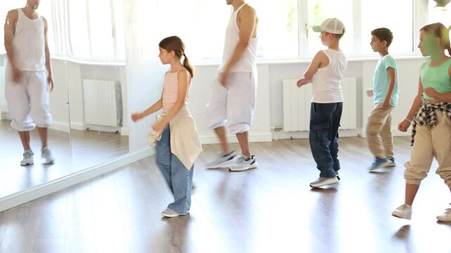 schoolchildren with teacher have dance and sing lesson