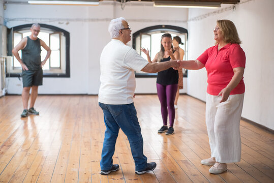 Senior Caucasian couple learning dance steps in studio. Retired partners wearing glasses dancing in class with teacher doing rhythm clapping. Dance, hobby, healthy lifestyle concept