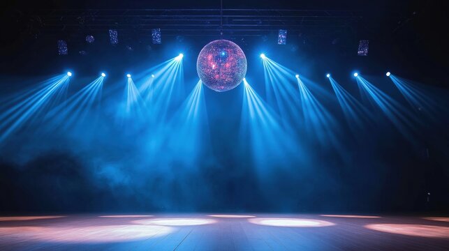 Stage with disco ball, bright lights. Wooden floor, vibrant colors. Purple, pink, blue illumination, club atmosphere. Nightlife event, retro dance party background, disco era vibes. Entertainment,