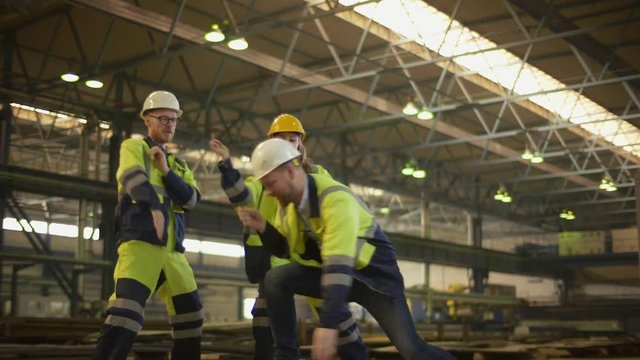 Multicultural engineers dancing at modern manufacturing factory and clapping hands. Employees in safety hard hats celebrating succsess at background of welding sparks flying.