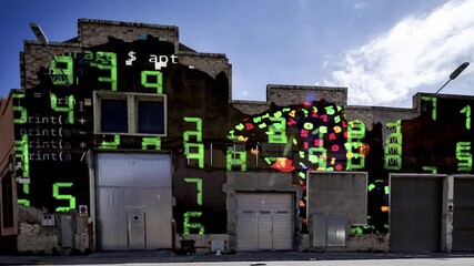 industrial complex with neon disco dancer overlayed on the wall