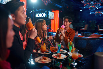joyful mixed-races positive youth dancing moving rhythmically in good mood at home party and singing into microphone, male and female having fun in neon disco light, retro style, karaoke concept