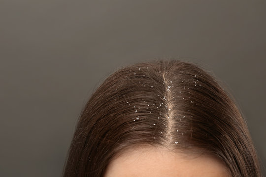 Woman with dandruff in her dark hair on grey background, closeup