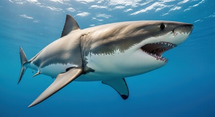 Great White Shark Swimming in Blue Ocean Water with Open Mouth Showing Teeth