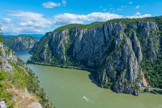 Amazing nature landscape of the Danube River. Tourist cruise ship passes by the gorge. Summer sky with clouds.