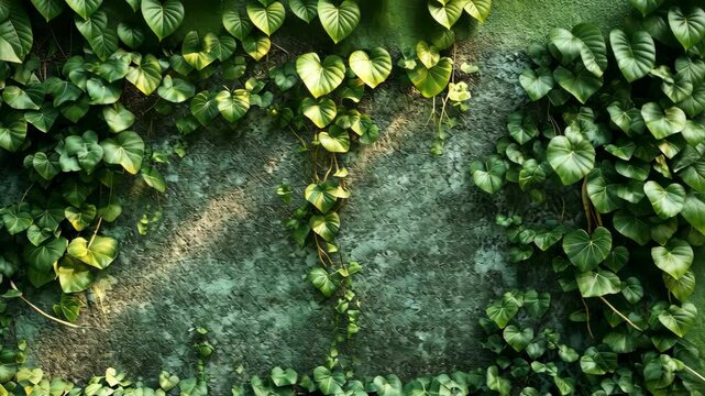 Lush green ivy climbing a weathered stone wall, sunlight dappling the surface