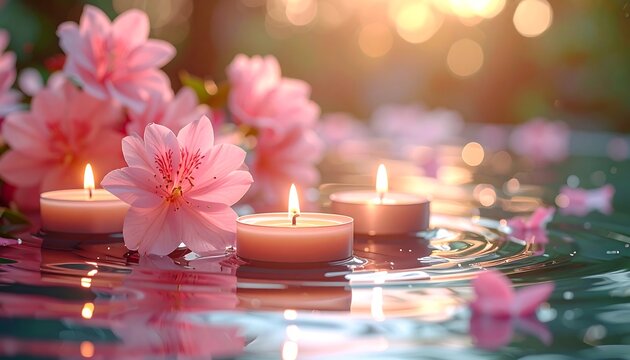 Three lit candles float on water among pink blossoms, sunlight dappling on the surface creating a serene ambience