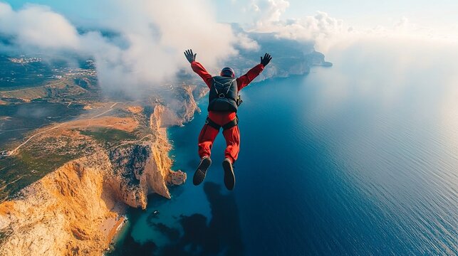 A thrilling aerial shot of a wingsuit flyer gliding at high speed through a majestic mountain valley, the ultimate in human flight.