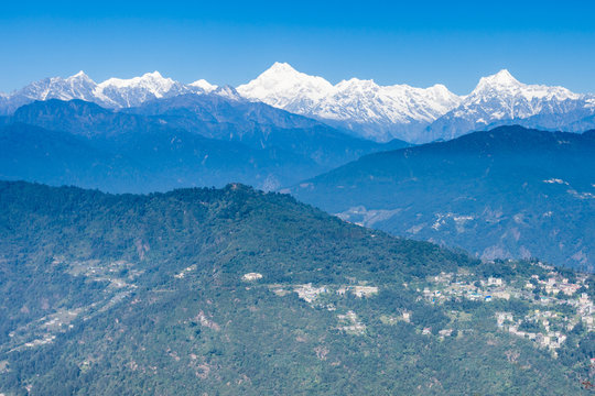 Scenic mountain road near Lava Kalimpong, India, with the Kachenjunga Himalaya range in the background