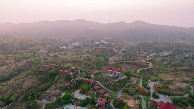 aerial drone shot showing huge resort getaway in the middle of mountains at hill station kumbalgarh, shimla, darjeeling in India. Showing the many tourist and travel places in the himalayas