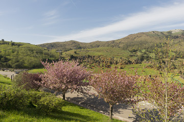 Picturesque tea plantation on sunny mountain slopes. Green tea crop cultivation, agriculture farming. Rich fields, rows, harvest, nature landscape with trees, sky. Healthy beverage, natural drink,