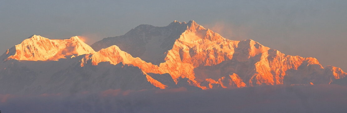 View of a mountain ridge of Kanchendzhonga in the State of Sikkim, from the neighborhood of the city of Darjeeling, early in the morning, till the sunrise.