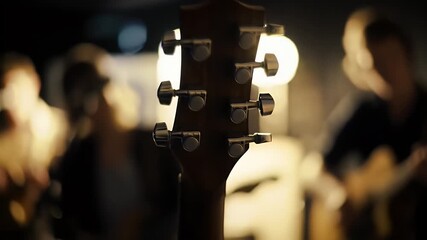 Close Up Of Acoustic Guitar Headstock During Band Performance In Dark Room