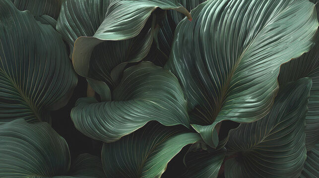 Dark green leaves background. Minimal neutral aesthetic. Tropical plant art texture. Botanical tropic garden creative layout banner.