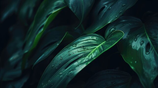 Dark green leaves pattern background, Natural background and wallpaper. Black tropical abstract green grass texture. Ornamental plant in the garden. Eco wall. Organic natural background