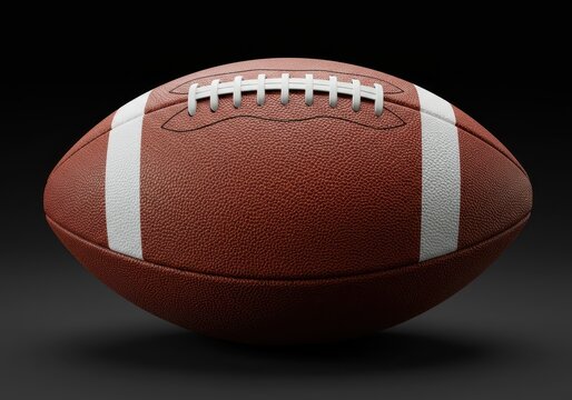 Close up of an american football on a dark background with white stripes and laces