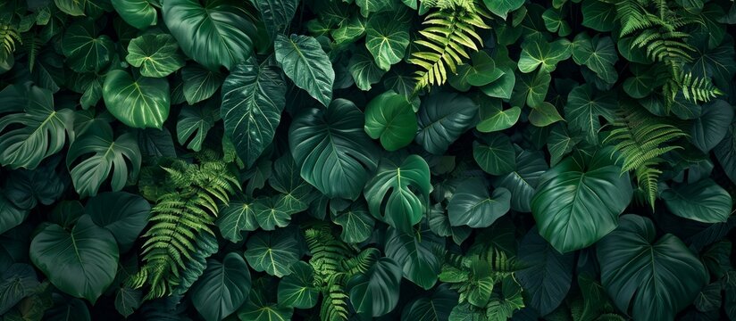 Dark green plants growing in a lush foliage background of tropical leaves like anthurium, epiphytes, or ferns, forming a beautiful green plant wall design in a cloud forest.