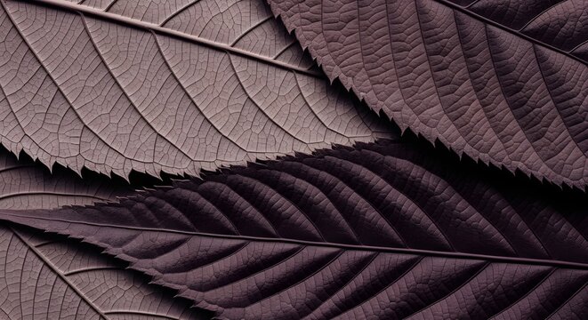Detailed macro photograph of dark purple and brown overlapping leaves texture background