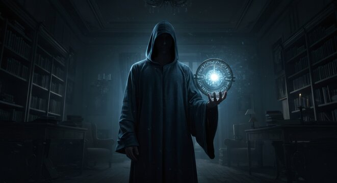 Evil wizard conjuring a spell in a dark room with a glowing orb. Dark ritual and magic concept for fantasy book.
