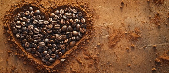 Coffee grains in heart shape on sandy surface expressing love for coffee arranged in a frame design with ample copy space viewed from above