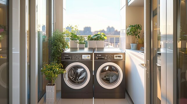 Minimalist balcony, minimalist, front 2 dark gray washing machines placed under, laundry cabinet. Generative AI.