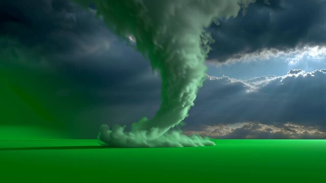 Majestic tornado forming over vibrant green field under darkening stormy clouds approaching