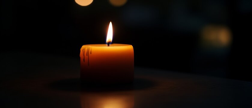 Bright candle flame glowing in a darkened space, creating a serene, calm ambiance in a dimly lit room