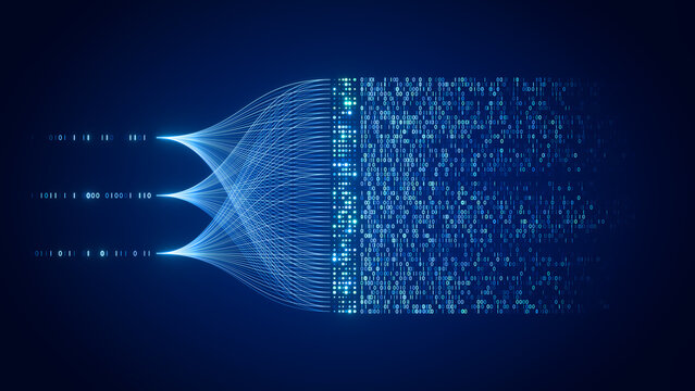 Artificial intelligence data processing and machine learning concept, digital neural network with binary code and data flow visualization on blue background