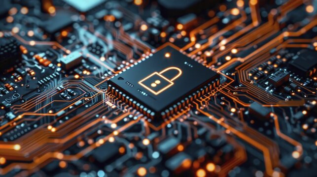 Cyber defense system visualization with padlock in the center of digital network and glowing blue neon connections, futuristic cybersecurity technology, secure data protection and information safety