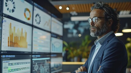 Businessman analyzing growth charts in modern office setting, showcasing data driven insights and strategic planning