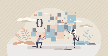 Collecting data and big information volume gathering tiny person concept. Cloud computing software with automatic server info catching vector illustration. Digital online document analysis for storage