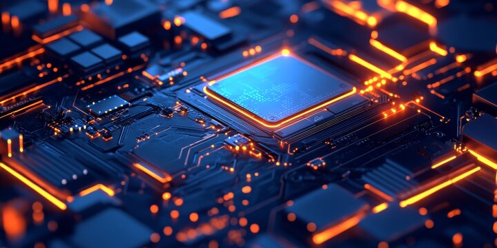 A futuristic computer chip with glowing lights is shown against a blue background. This represents the powerful processing capabilities of a quantum computer, used for handling large amounts of data.
