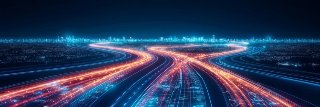 Futuristic city highway with glowing digital data streams.
