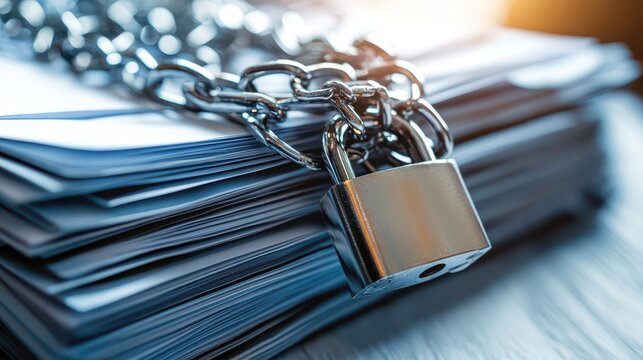 A stack of secured documents locked with a chain and padlock, symbolizing confidentiality and data protection in a digital age.