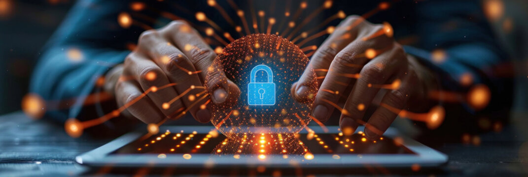 Futuristic digital interface with a glowing padlock symbol being activated by human hand. Concept cybersecurity, data protection, encryption, and secure access in high-tech environment.