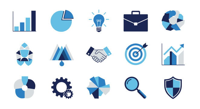 Business and technology line icon set. Vector pictograms of data layers, puzzle, optimization, scaling, analysis, and security, thin linear illustration.