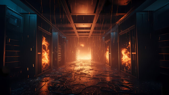 Data center fire with burning servers racks, Internet unexpected outage, big data center offline due fire in servers room, black thick smoke in computer data center, generative AI