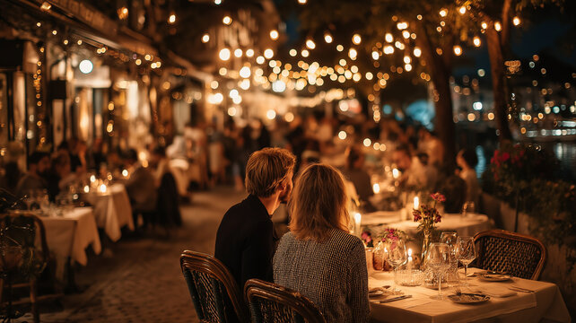 Romantic Cafe Evening. Couple enjoying a romantic evening at a chic cafe. String lights and candlelight create an inviting atmosphere.