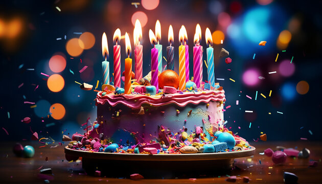 Tarta de cumpleaños de colores llamativos con velas encendidas y confeti en el aire. Decoración de pastel sorpresa.