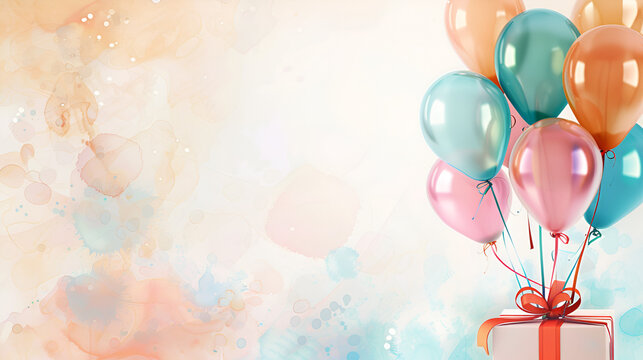 fondo con efecto acuarela con espacio para copiar con elementos decorativos de fiesta de cumpleaños con globos de colores y una caja de regalo fondo para diseñar estilo moderno y romantico
