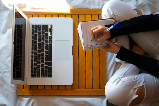 Top view of a woman working in bed and writing on her datebook.