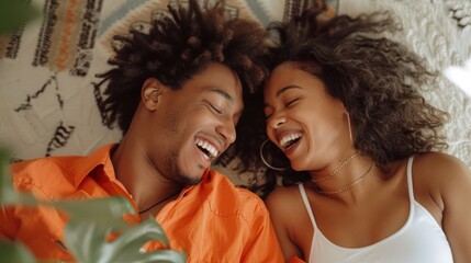 Playful romantic couple making silly faces while lying on the floor, enjoying a fun moment together