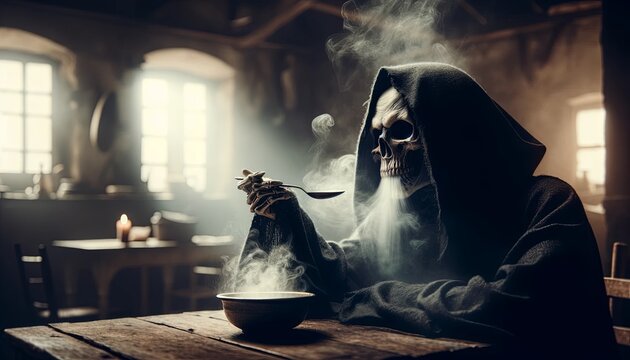 A skeleton in a dark room eating soup