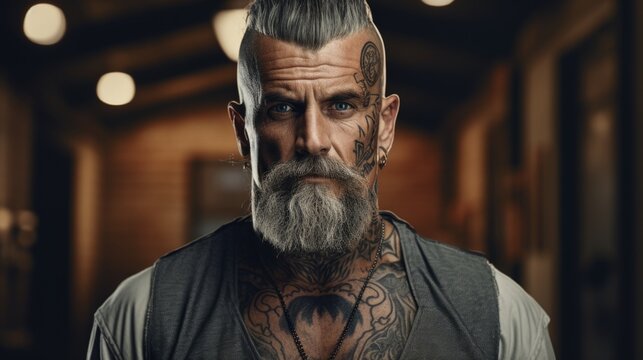 brutal man with tattoo in dim light