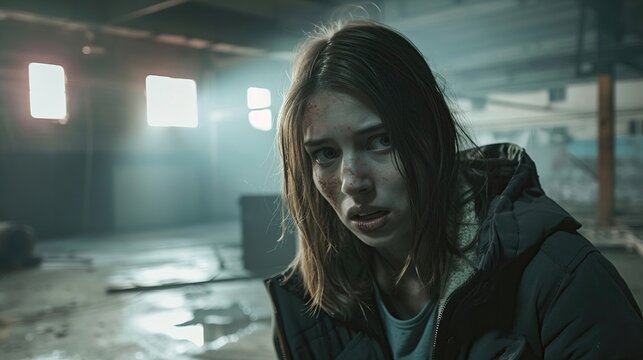 A terrified young woman hiding from zombies in an abandoned warehouse, low light and suspenseful