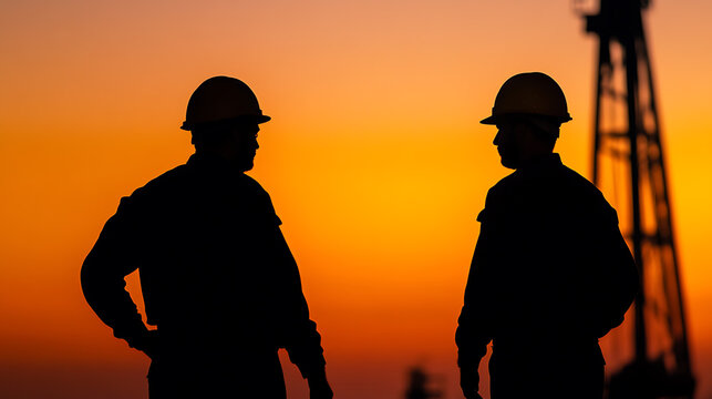 Silhouette of two workers in hard hats at sunset, possibly on a construction site or industrial facility, symbolizing teamwork, industry, and the end of a work day at the plant.