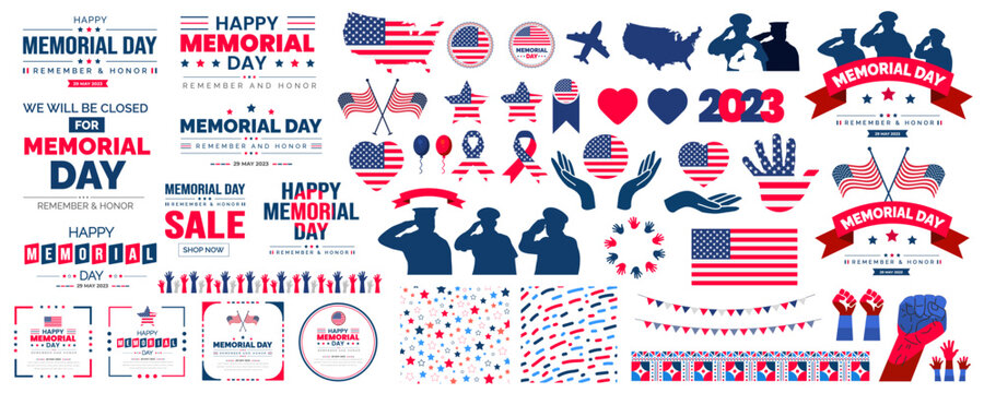 happy memorial day text, typography, usa flag and memorial day elements big set bundle design. USA flag, the Statue of Liberty fireworks, balloons, and many more illustrations in one big bundle.